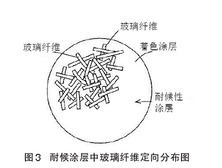 該高耐候性彩色水泥瓦制作流程是將以水泥為主要成分的坯料擠壓成坯,瓦體養(yǎng)護(hù)硬化,涂以涂料,修平整,形成底層涂膜層。為了防止瓦中堿分對(duì)上層涂膜層的侵蝕,可在底涂膜層上,涂以耐堿性涂料,形成耐堿涂膜層,然后涂以著色涂料,形成裝飾涂膜層,最后涂以耐候涂料,形成耐候涂膜層(見(jiàn)圖1和圖2)。著色涂層由含有所需著色顏料的水性丙烯酸涂料構(gòu)成,其厚度約為100μm。耐候性涂層由與著色層相同的水性丙烯酸涂料與耐候性纖維(添加量為7%~12%)組成的涂料構(gòu)成,其厚度約為 25μm。耐候性涂料用噴槍高壓噴涂在瓦著色裝飾涂層上。耐候性涂料涂覆在著色涂層上時(shí),玻璃纖維以平躺姿態(tài),水平方向無(wú)序隨機(jī)定向分布(見(jiàn)圖 3)。對(duì)瓦涂以耐候性涂料后,為了固定玻璃纖維,約在100℃下充分干燥。